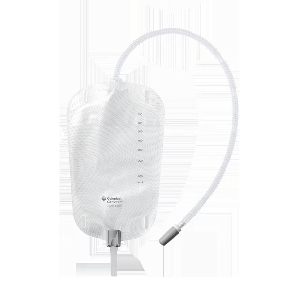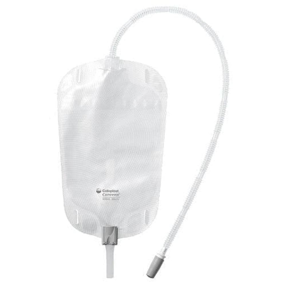 Conveen® Security+ Contour Urine Collection Bags by Coloplast are leg-mounted urine bags designed to manage incontinence comfortably and securely. These bags are available in various capacities to suit different user needs.