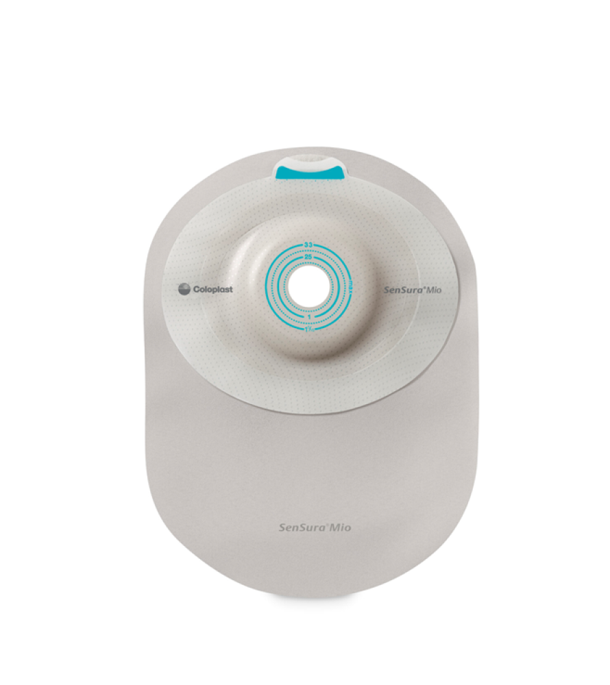 SenSura® Mio – One-Piece Closed Convex Ostomy Bag with Inspection Window, Neutral Grey, Full-Circle Filter 430, Belt Ears, Large A product by Coloplast, designed for ostomy users who require additional support around the stoma, especially in cases of recessed or irregular stomas.